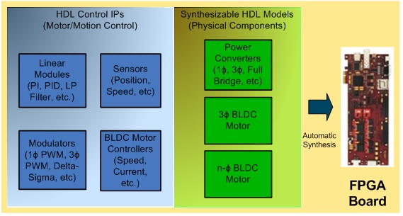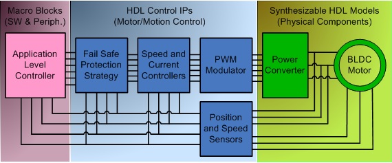 Some of the IP cores available include basic functions (PI, PID, filters, etc. macro-modules (position, speed, torque controllers, etc.) and driver/motor models (power drivers, BLDC motors, etc.). .